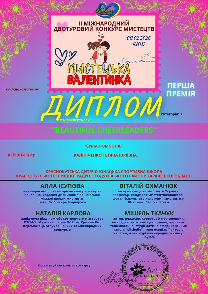 Щирі вітання команді “BEAUTIFUL CHEERLEADERS” Краснокутської дитячо-юнацької спортивної школи з почесним І місцем🥇🏆 у II Міжнародньому двотуровому конкурсі мистецтв “Мистецька валентинка” ! 🏆💙